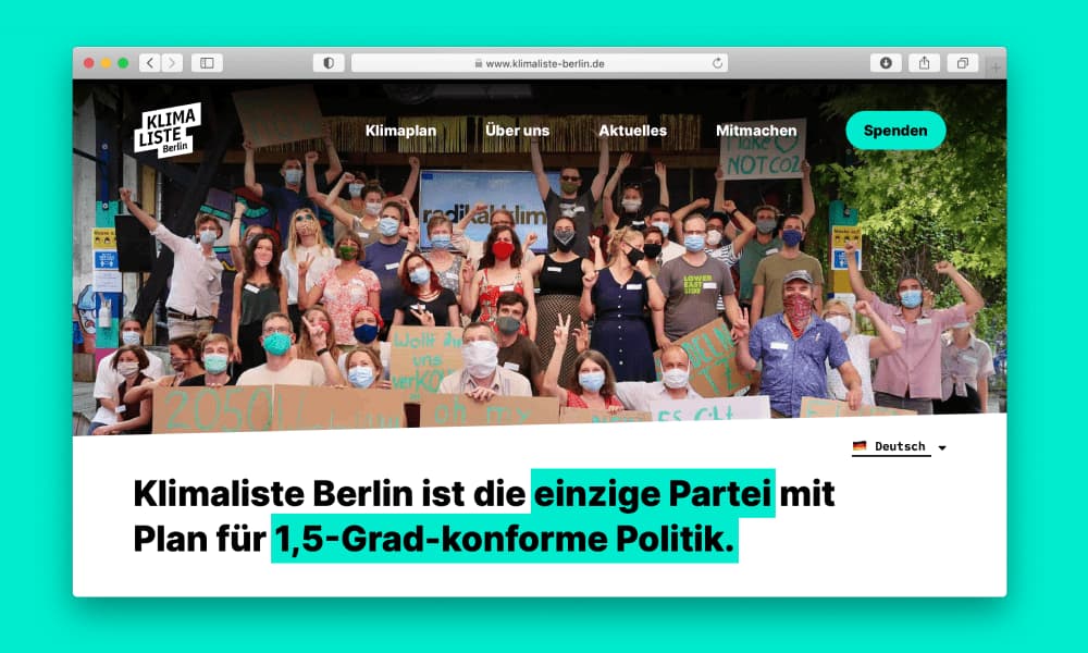 Für die Landespartei Klimaliste Berlin haben wir vor der Wahl 2021 an der Kommunikationsstrategie gearbeitet sowie Corporate Design, Website und Werbemittel gestaltet.